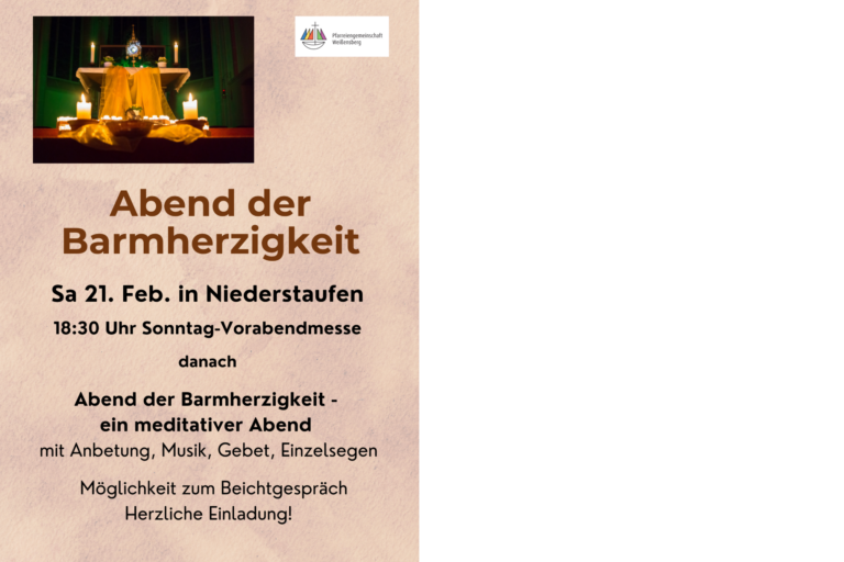 18:30 Uhr Vorabendmesse in Niederstaufen, anschließend Abend der Barmherzigkeit ein meditativer Abend mit Anbetung, Musik, Gebet, Einzelsegen…
