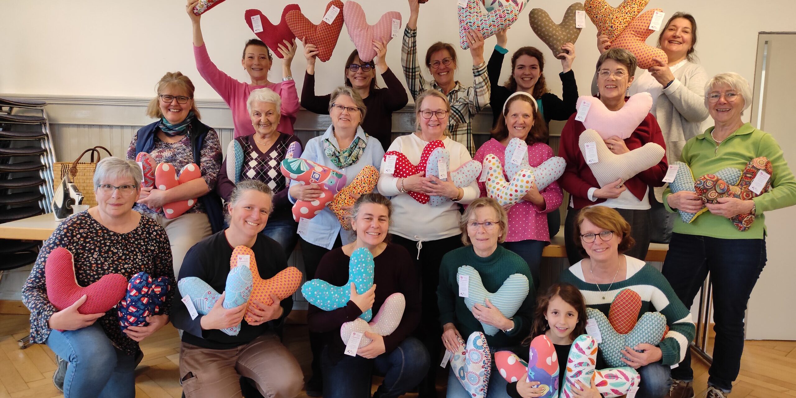 Unter dem Motto „Frauen helfen Frauen“ fanden sich 22 Frauen im Pfarrheim „Haus Sigmar“ zum gemeinsamen Fertigen von Herzkissen für Brustkrebspatientinnen ein.