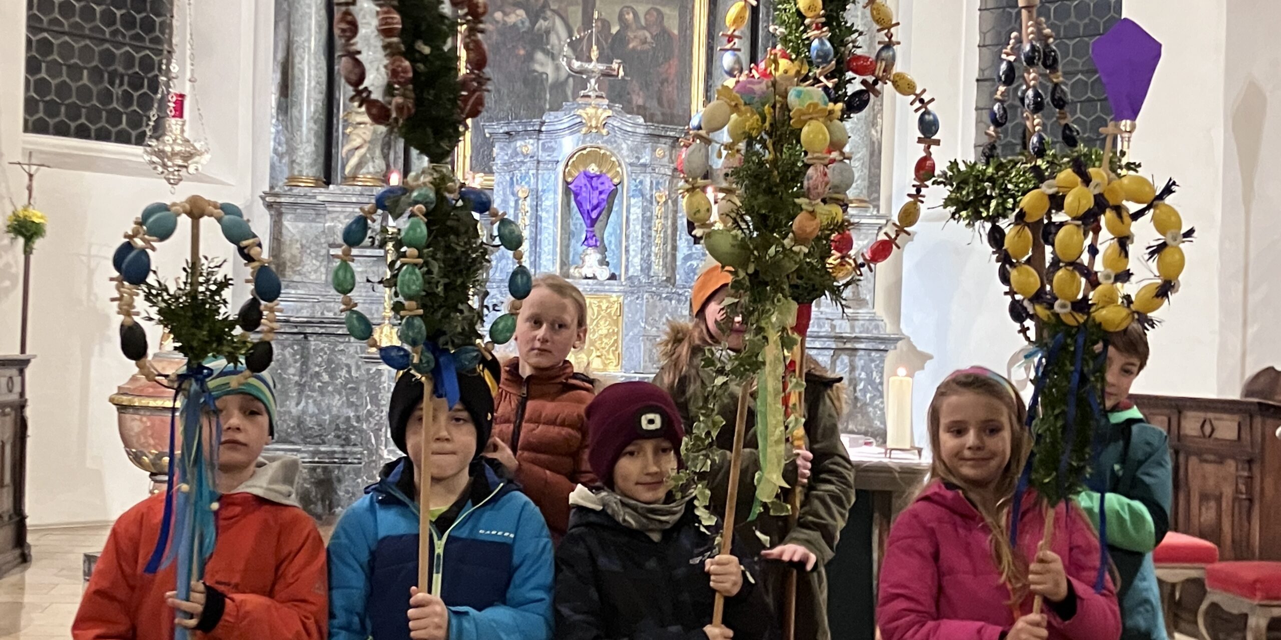 Die Kinder zogen mit schön geschmückten Palmen in die Kirche.