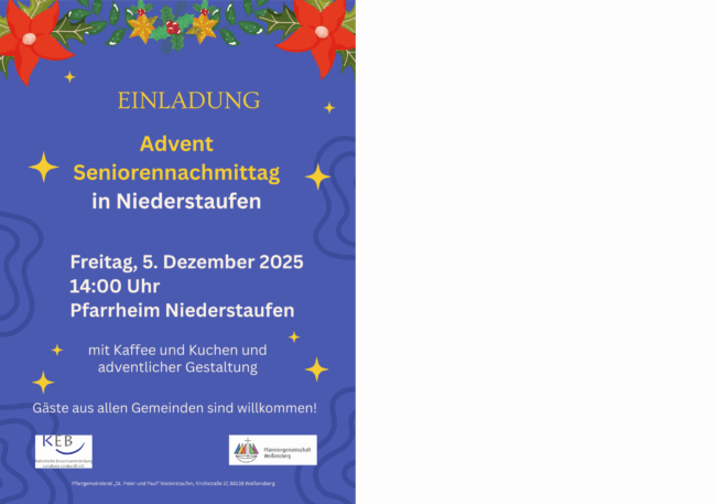 um 14 Uhr in Niederstaufen, mit Kaffee und Kuchen und adventlicher Gestaltung. Senioren aus allen Pfarrgemeinden sind herzlich willkommen!