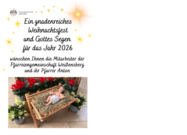 Ein gnadenreiches Weihnachtsfest und Gottes Segen für 2026 wünschen Ihnen die Mitarbeiter der Pfarreiengemeinschaft Weißensberg und Ihr Pfarrer Anton.