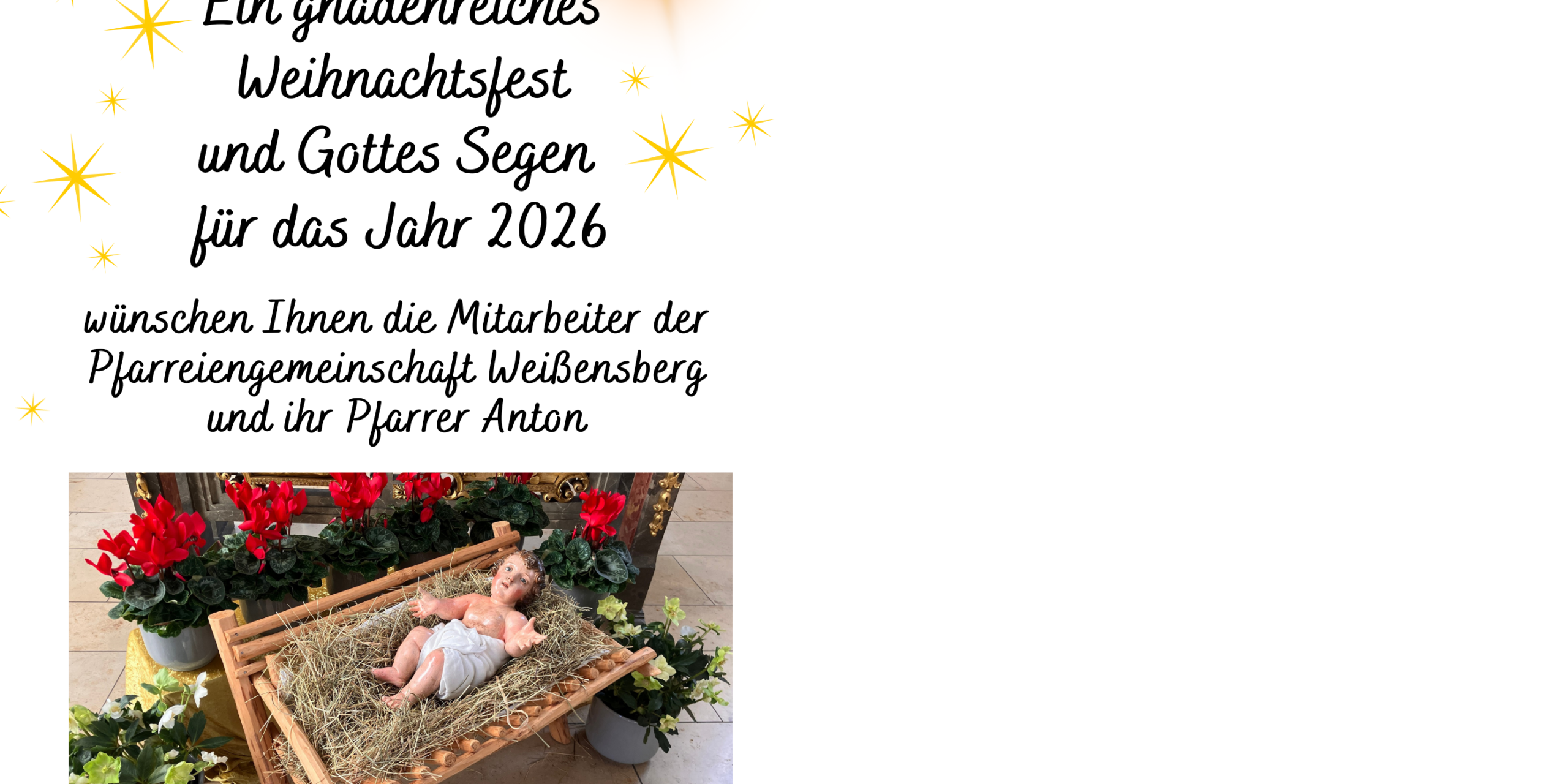 Dez.142025Ankündigung PGEin gnadenreiches Weihnachtsfest und Gottes Segen für 2026 wünschen Ihnen die Mitarbeiter der Pfarreiengemeinschaft Weißensberg und Ihr Pfarrer Anton. Auch interessant24.12. | Familienandacht mit Krippenspiel14. Dezember 202527.12.+2.1. | Lieder an der Krippe8. Dezember 2025Friedenslicht aus Betlehem.7. Dezember 2025Mi 17.12. + Fr 19.12. | Bußandachten + Beichte!7. Dezember 2025