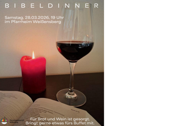 Sa 28.3. | Bibeldinner Ankündigung PGVon Claudia Herberth12. März 2026um 19:00 Uhr im Pfarrheim Weißensberg. Für Brot und Wein ist gesorgt! Bringt gerne etwas fürs Buffet mit.