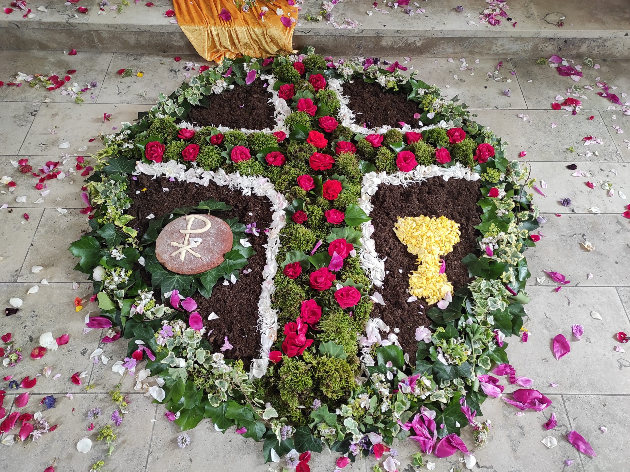 DetailsDurch die schlechte Wetterprognone für Fronleichnam wurde nur ein Blumenteppich in der Kirche St. Gallus vom Frauenbund Sigmarszell gelegt. Das Fest fand mit allen Gläubigen aus der PG, sowie den Fahnenabordnungen der Vereine aus Weißensberg, Niederstaufen und Sigmarszell und unter der musikalischen Gestaltung vom Musikverein Sigmarszell in der Kirche statt. Petrus hatte allerdings doch besseres…